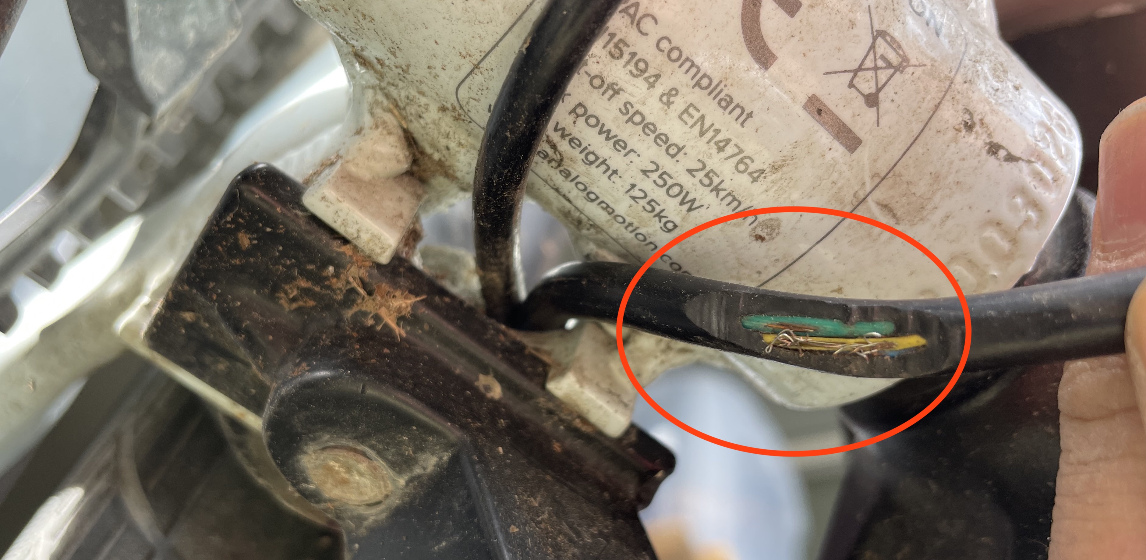 Additionally, check for any damage to the motor cable (see below). This is caused by rubbing the tyre during motion and can be prevented by ensuring the motor cable is correctly secured away from the rear tyre.